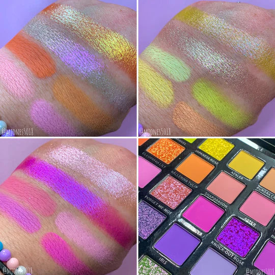 No contiene crueldad y contiene 24 tonos pastel mate pigmentados, cremosos y fáciles de difuminar, 11 brillos dúo-cromo únicos y 1 brillo multicromo especial.