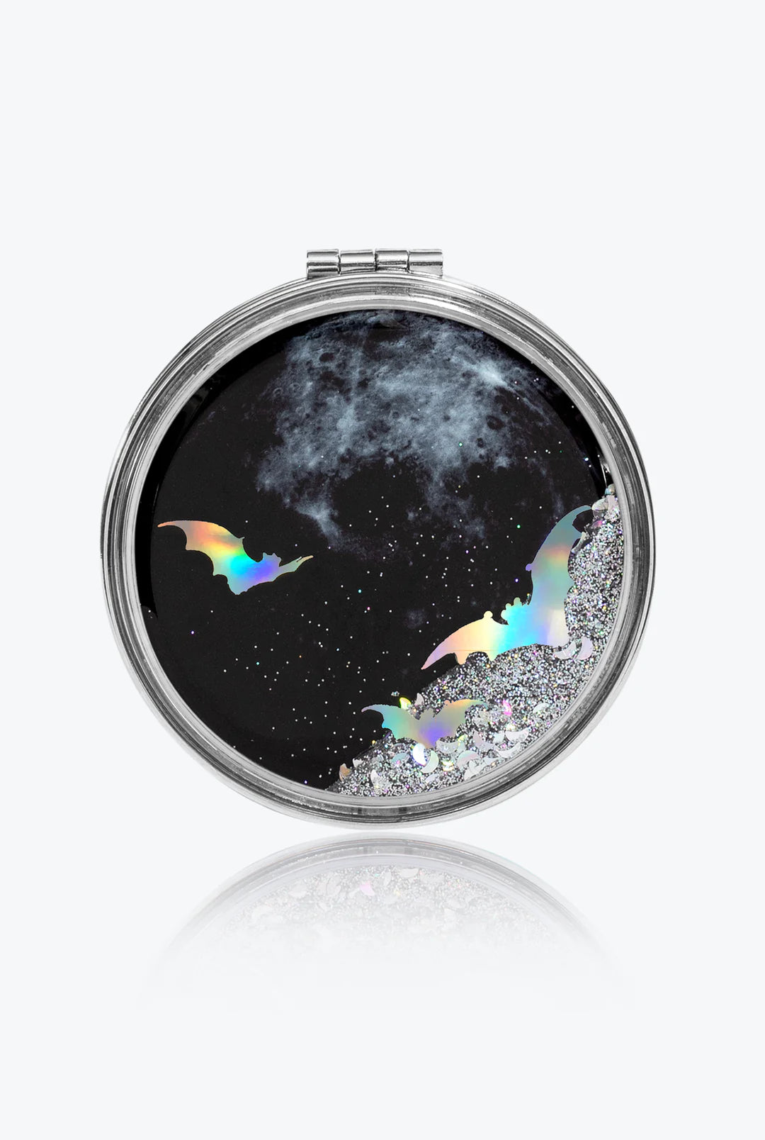 Questo delizioso specchio bifacciale presenta una luna nera incastonata in un nostalgico mondo di stelle e lune olografiche, con pipistrelli olografici che si librano sopra per completare il tutto. Sulla parte anteriore è presente il nostro etereo logo olografico Black Moon. Portateci con voi ovunque andiate, fino a 🌙 e ritorno!